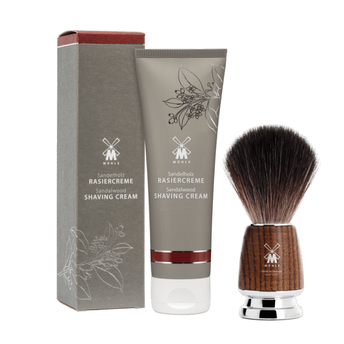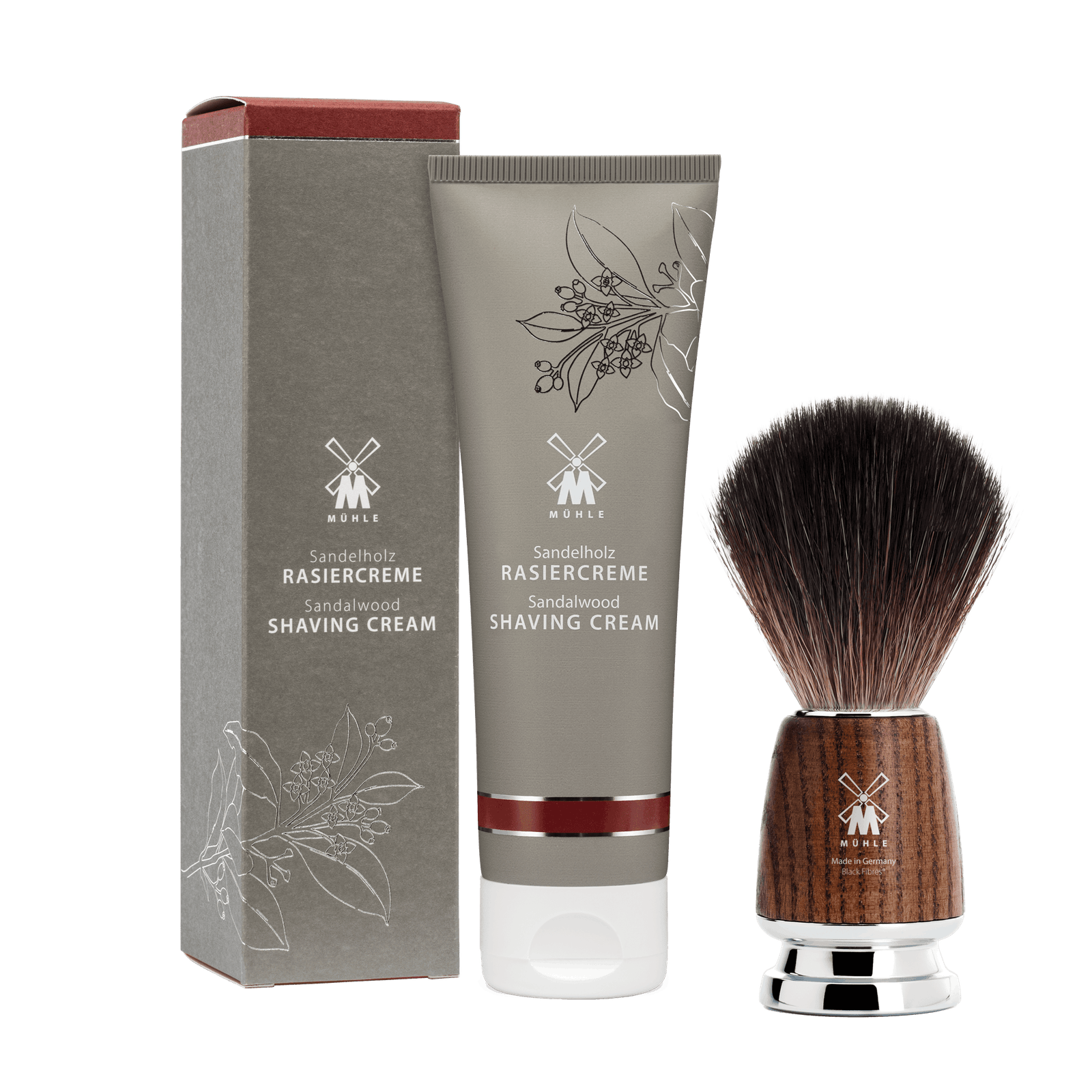 Rinkinyje rasite RYTMO skutimosi šepetėlį iš uosio medienos su Black Fibre sintetiniu pluoštu, kuris yra patvarus ir malonus odai. Taip pat pridedamas MÜHLE SHAVECARE sandalmedžio skutimosi kremas 75 g tūbelėje, medvilninis piqué rankšluostėlis ir informacinis „How To Shave“ bukletas.