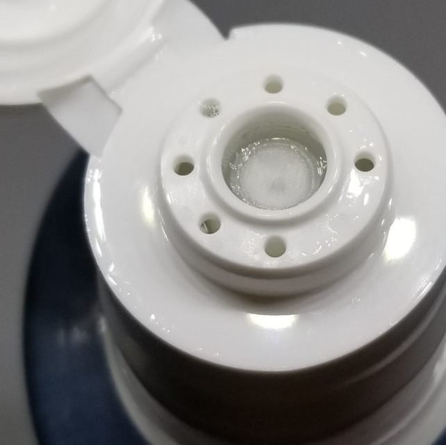 Taigi, nusiskutau su Reuzel skutimosi kremu, nuvaliau kremo likučius drėgnu rankšluosčiu ir perėjau prie putų. Paėmus buteliuką jaučiasi, jog priemonė skysta – tai kaip gi tos putos atsiranda? Taigi, buteliukas viršuje turi įdomų dozavimo mechanizmą, tarsi tinklelį, dėl kurio skystis ir tampa putomis.